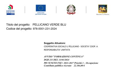 Siamo lieti di annunciare il nostro nuovo progetto "Pellicano Verde Blu", cofinanziato dall'Unione Europea e dalla Regione del Veneto nell'ambito del programma PR VENETO FSE+ 2021-2027. Il progetto rientra nell'Avviso "Formazione Continua", DGR 231 del 13/03/2024,...